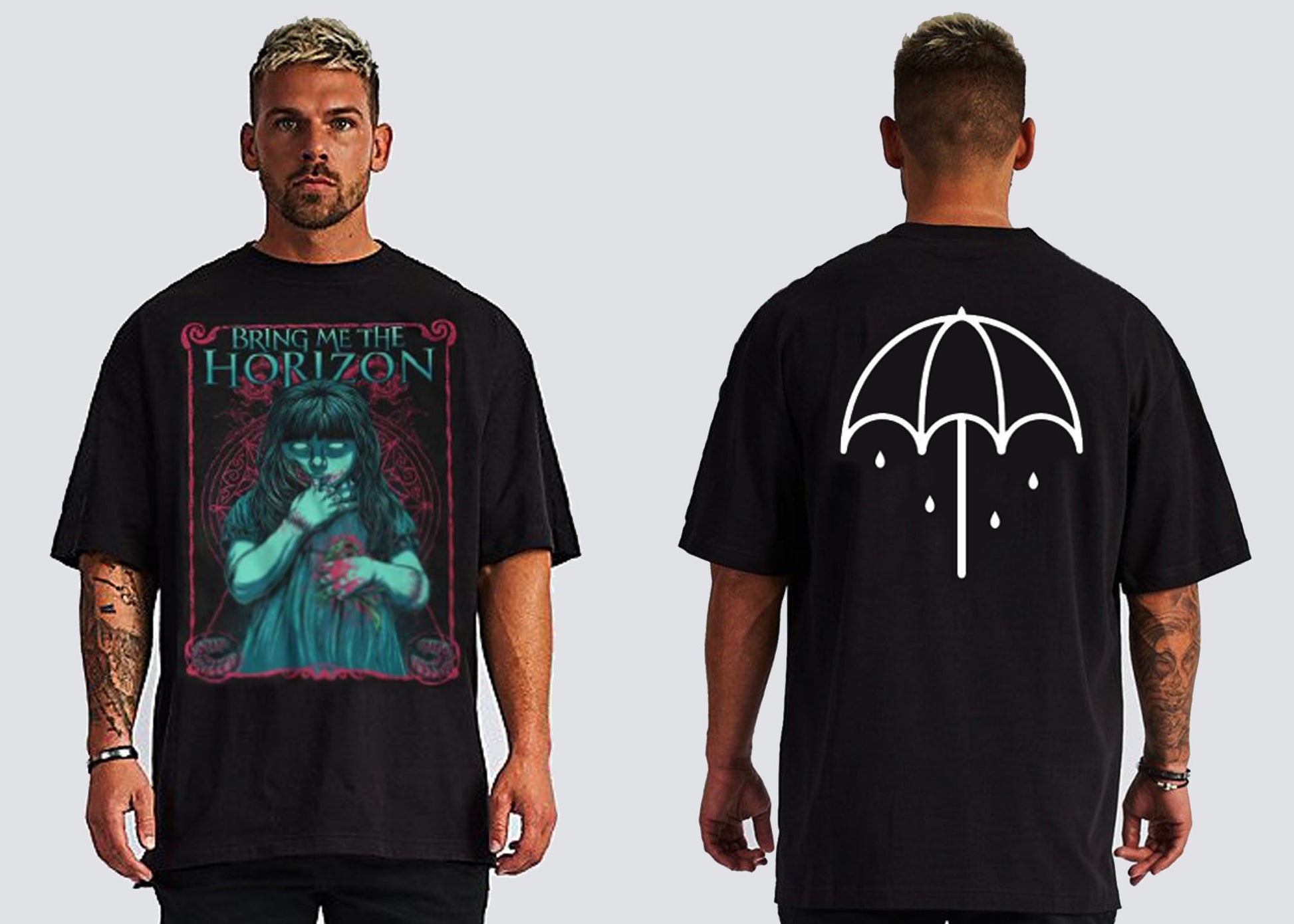 This premium black t-shirt features a high-quality silk screen print of the "Bring My Orizon" design. Crafted from 100% cotton for superior comfort and durability, it maintains its shape and color through repeated washing. The professional silk screen technique ensures crisp, vibrant graphics that won't crack or fade over time.