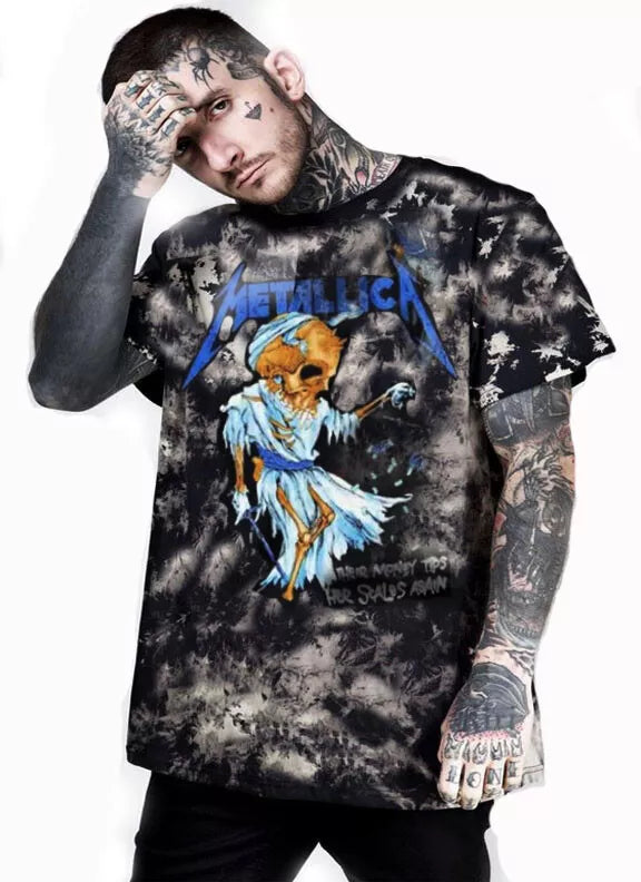 This Metallica "Their Money Tips" T-shirt features a vibrant tie-dye design crafted from 100% cotton for superior comfort and breathability. Printed using high-quality silk screen techniques, it ensures lasting color and detail. Ideal for fans seeking both style and durability in their band apparel.