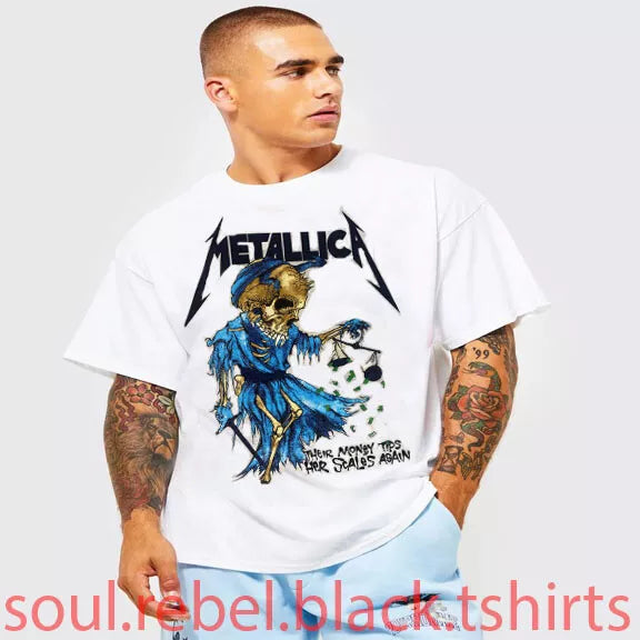 This Metallica "Their Money Tips" T-shirt is crafted from 100% pure cotton, ensuring breathability and comfort. Featuring a high-quality silk screen print, the design offers durability and vibrant detail that lasts. Ideal for fans seeking both style and long-lasting wear, this shirt combines classic material with expert craftsmanship.