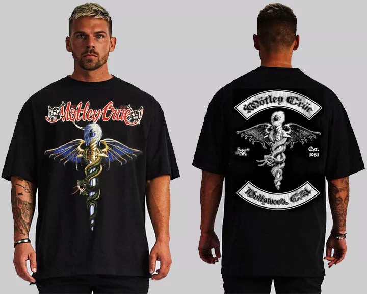 This Motley Crue T-shirt, crafted from 100% cotton, offers exceptional comfort and durability. Featuring a high-quality silk screen print, it showcases the iconic Hollywood, CA design with vivid detail and lasting color. Ideal for fans seeking authentic band apparel with expert craftsmanship.