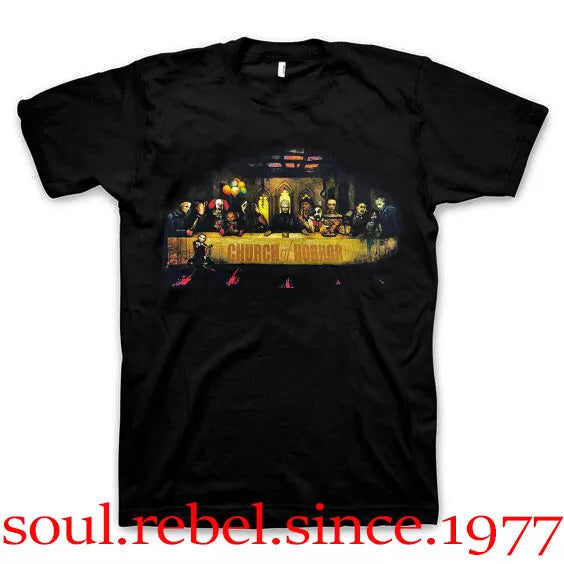 Experience cinematic sacrilege with our "The Last Supper Horror Characters" t-shirt. Meticulously silk-screened on premium 100% cotton fabric, this shirt features an iconic tableau of horror's most notorious villains arranged in a macabre parody of the famous painting. The professional silk screening ensures vibrant, durable graphics that withstand repeated washing without cracking or fading.
